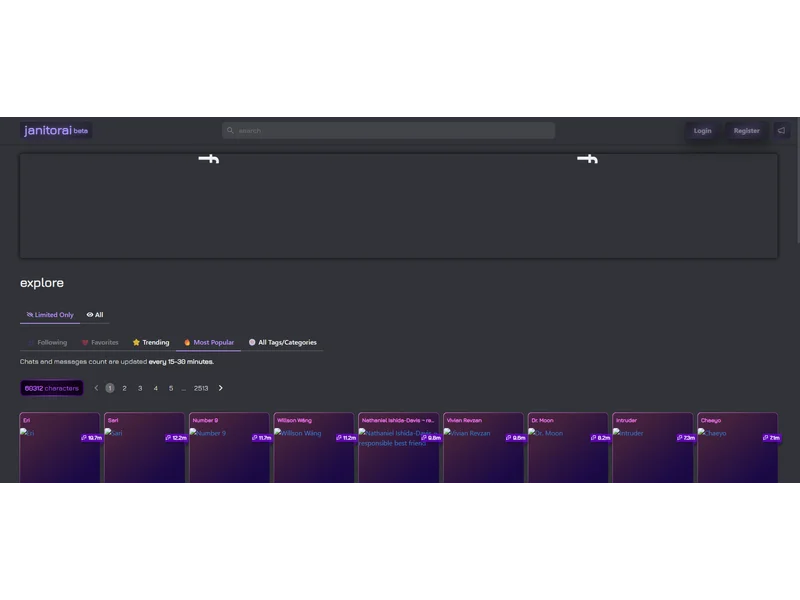 JanitorAI lets you chat with AI characters in a role-play format. The platform currently hosts over 29,129 characters and requires users to be 18+. When interacting with characters, you can choose between family-friendly (“Limited”) or mature (“Limitless”) content.